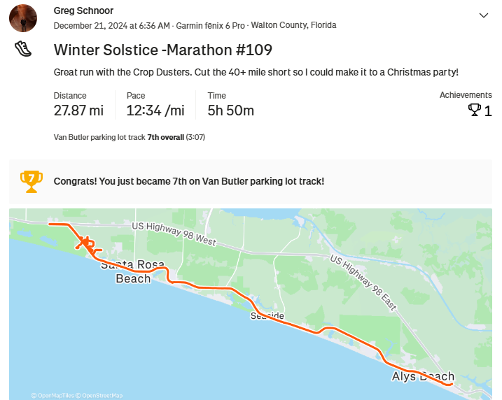Ran with the Crop Dusters in Destin and got marathon #109 on winter solstice 2024. Always great running with them.