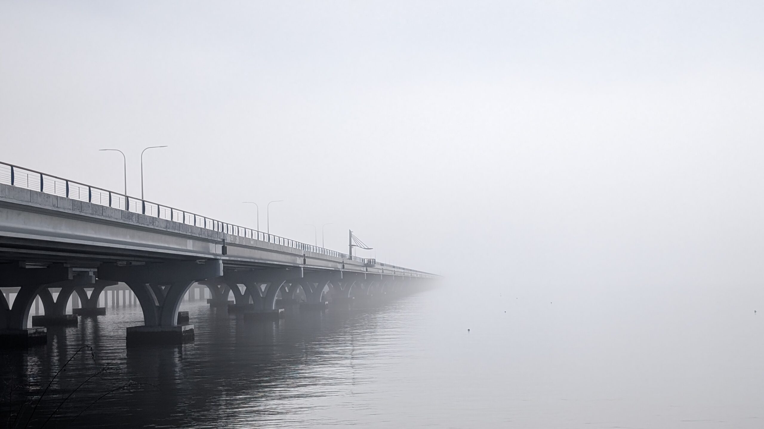 Some views from my run today with the crazy fog blocking the bridge and cities. The picture of the 3 mile bridge leading into the bay is facing towards Gulf Breeze. The brighter blue picture should be showing downtown Pensacola from the bridge. Looks like Pensacola