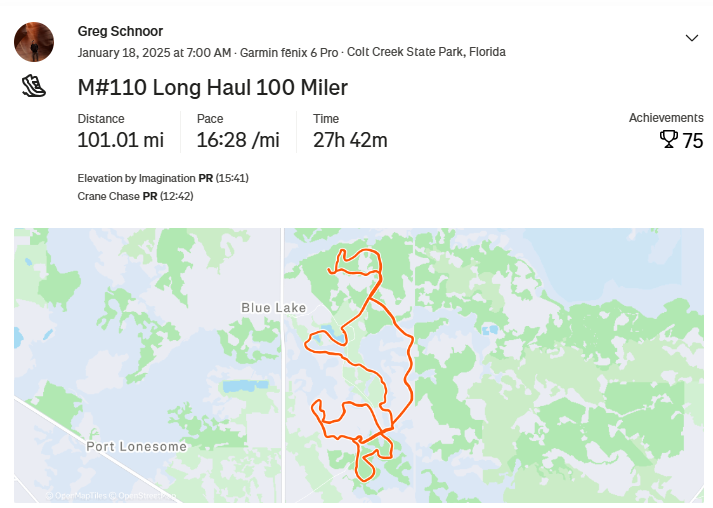 Finished my 13th 100 miler trail race today (112th marathon overall) at the Long Haul 100 near Lakeland, Florida. My knee issue held up pretty good but doing a couch-to-100 miler is not recommended to anyone!