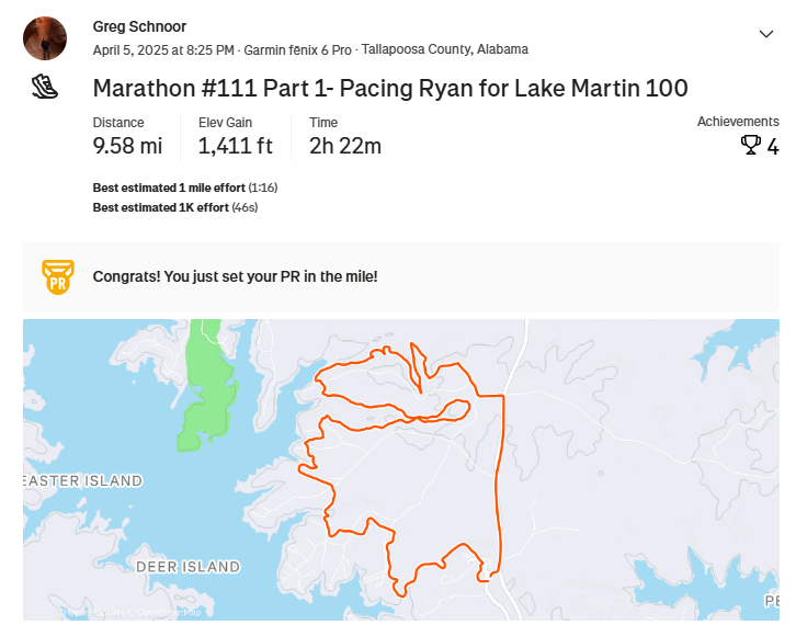 This was my third year in a row completing the Lang Haul 100 miler. My knee issue started flaring up and pretty much walked the majority of miles at the end.