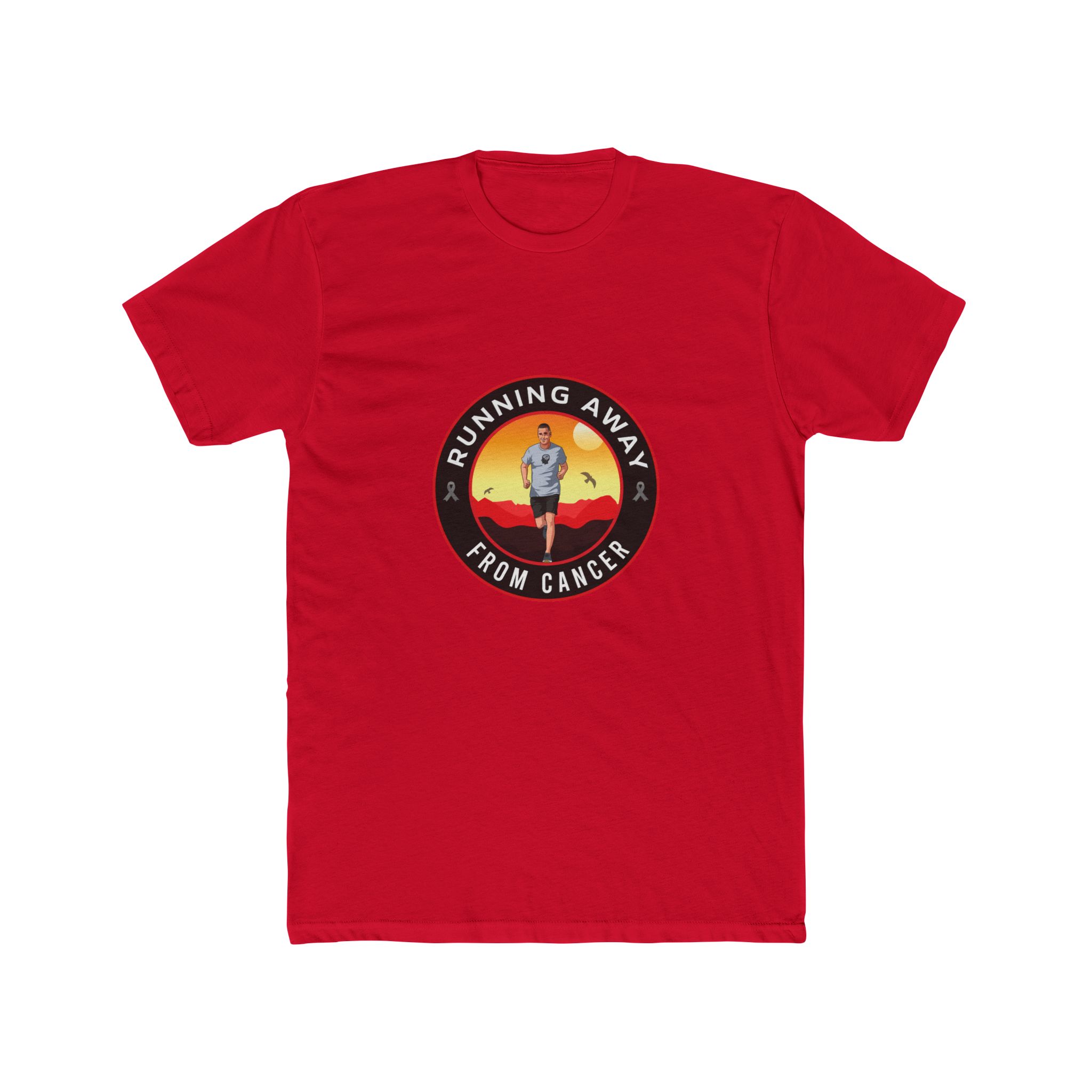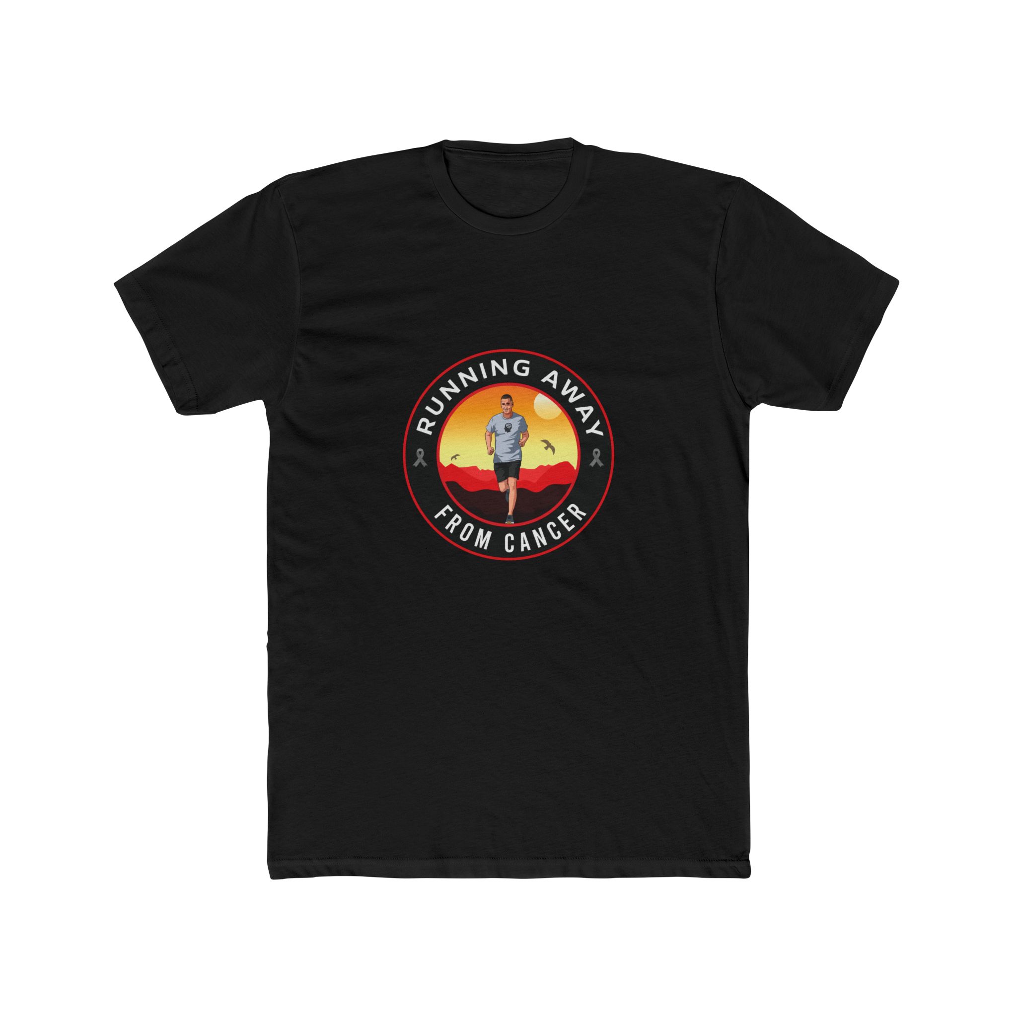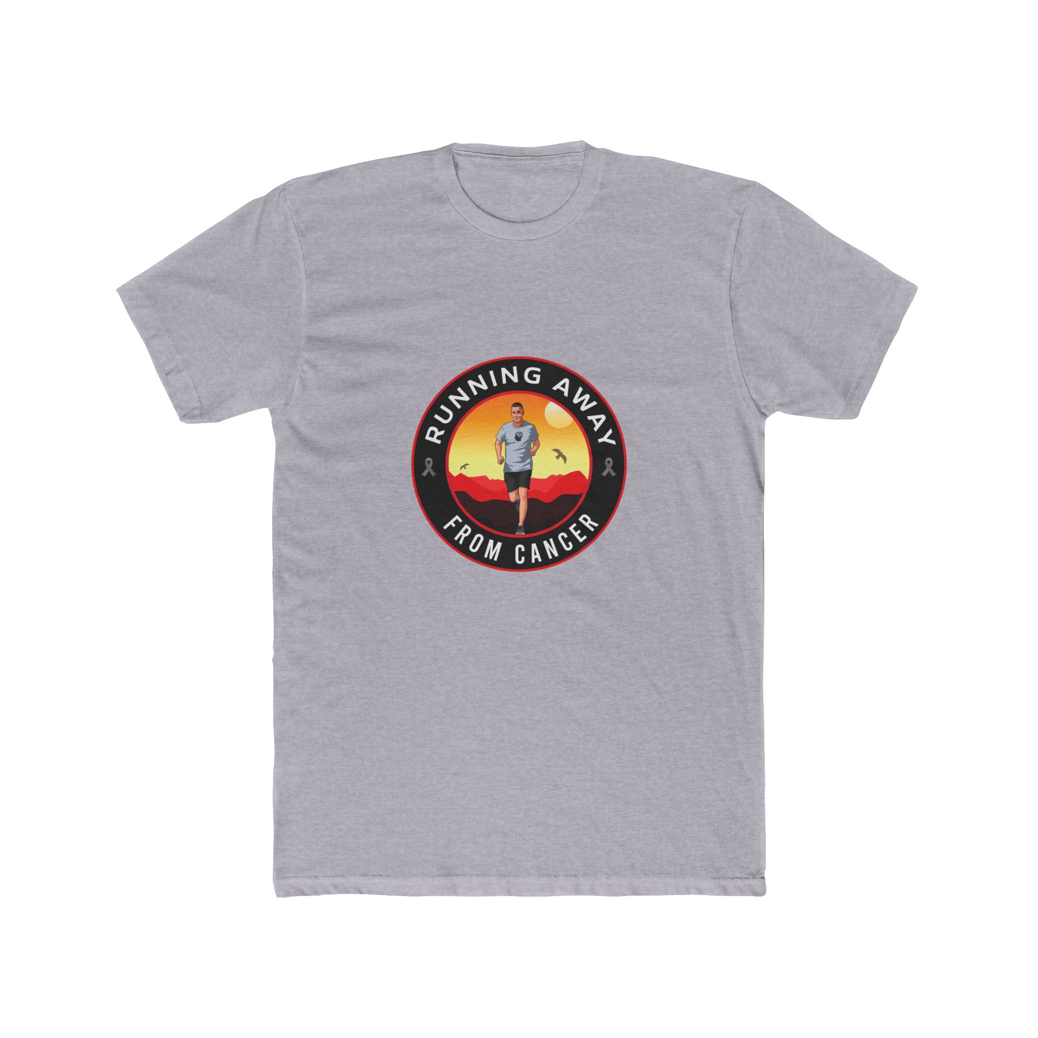 Lightweight and honest, this cotton crew tee carries a quiet, determined energy. A small circular design at the chest shows a lone runner against a warm sunset, the words “RUNNING AWAY FROM CANCER” arcing around the image. Wear it on training runs, recovery walks, or layered under a zip-up — it reads like a statement and a companion. The soft Next Level fabric feels breathable in all seasons, and the classic crew neckline keeps the look clean and wearable. Subtle reinforcement details — shoulder tape and side seams — keep the tee holding its shape through repeated wears and washes. This shirt sits comfortably in the routines of people who move with purpose: runners, survivors, and supporters who want to carry resilience into everyday life and at events like charity runs, survivorship milestones, and low-key fundraisers.
