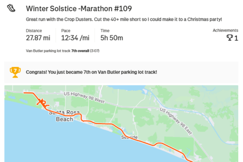 Ran with the Crop Dusters in Destin and got marathon #109 on winter solstice 2024. Always great running with them.